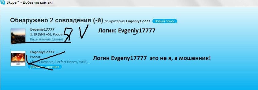 При обращении в скайп обращайте пристальное внимание не на ник (имя) пользователя, а на его логин (правой кнопкой мыши по контакту-личные данные-логин в skype)!