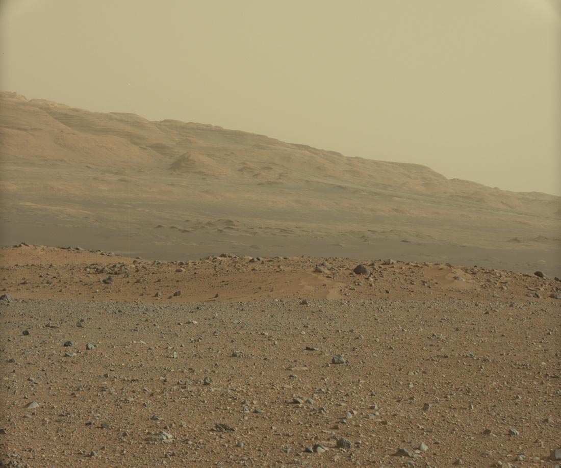 Показана юго-восточная по отношению к марсоходу местность. От места съемки до вершины горы Sharp примерно 16 км.