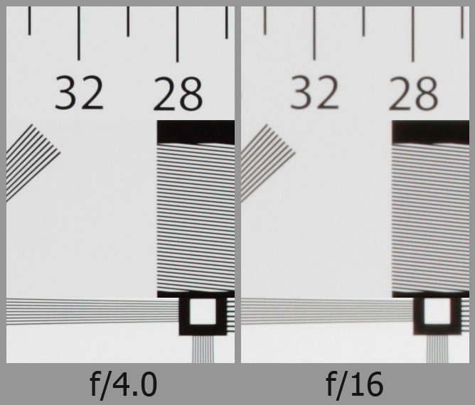 Если посмотреть на эту таблицу, то можно заметить, что пороговое значение диафрагмы, когда наступает дифракционное размытие зависит от размера пиксела (четвёртая колонка 'Pixel Size') и чем меньше пиксел, тем на более открытых диафрагмах будет теряться резкость, как это выглядит на тестовых снимках, можно посмотреть здесь. Отчётливо видно, что происходит с изображением по всему полю по мере закрытия диафрагмы, линии изображения на контрастных участках перехода теряют свою резкость и выглядят мягкими, как еще говорят фотографы - мыльными.