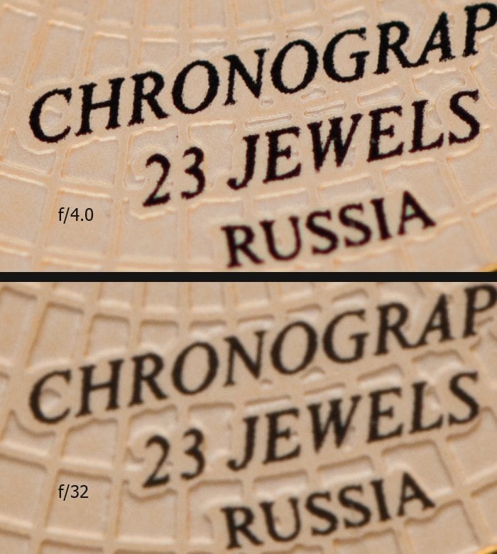 На первом снимке не все детали часов хорошо видны, часть из них не четкие, а часть совсем размыта из-за малой глубины резкости и слишком открытой диафрагмы, f/4.