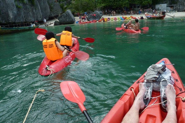 Мы устали и воспользовавшись случаем тихо прицепились к другому каяку. Эти две азиатки тащили наш трехместный каяк метров 200. Было одновременно неловко, стыдно и смешно. Бедняги еще до нас очень устали, но гребли как на олимпийских играх, желая побыстрее причалить.