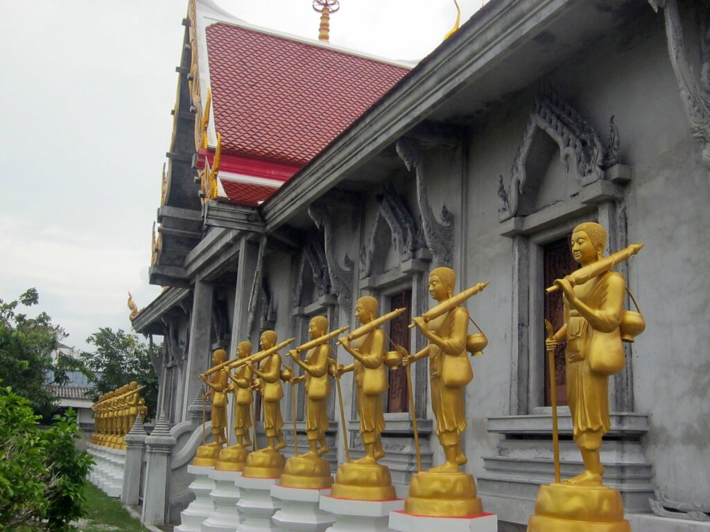 Один из храмов Сонгхлы, опоясанный такими совершенно одинаковыми фигурами (кстати, что у них в руках??). По внутреннему периметру тоже есть близнецы, правда, уже молящиеся. Внутри приличных размеров спящий Будда, над ним - впечатляющая ступа.