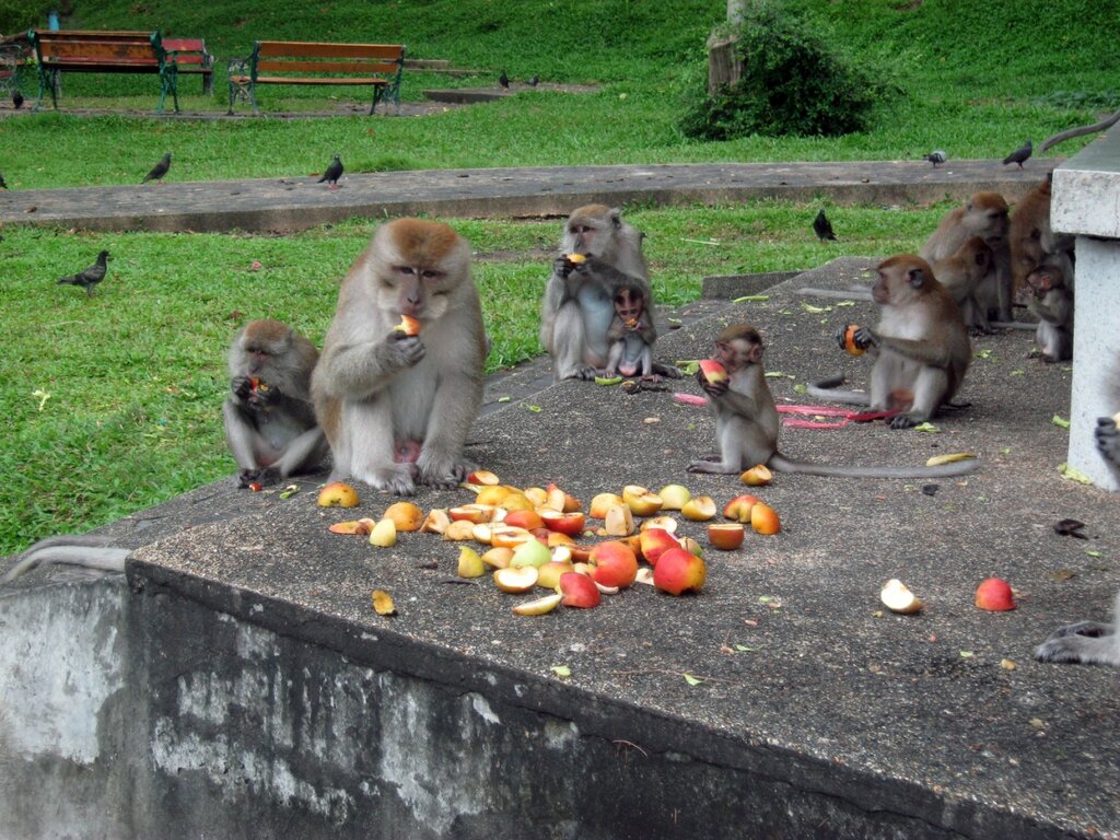 Местное стадо диких-диких обезьян, точат яблоки, принесенные сердобольной тайкой: