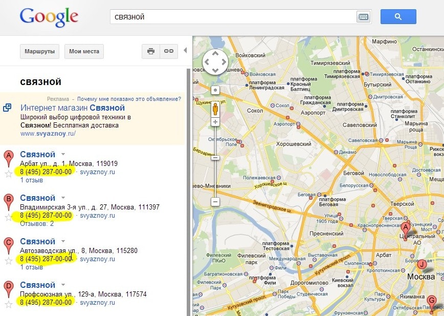 Имеем, 3 филиала в Москве как сделать так чтобы все адреса отображались на карте google (на данный момент они склеиваются в один)?