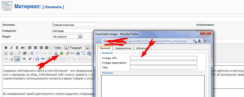 нажимаете на иконку с деревом, в первом поле ссылку на изображение, в поле превью оно подгрузится, во второй вкладке можете поставить размер, обтекание текстом, отступы и классы.