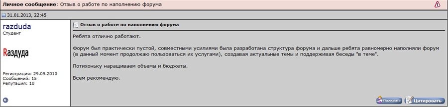 Заказывал постинг в количестве 450 постов на автомобольном форуме, очень порадовало качество работы, видно, что постеры неплохо разбираются в данной тематике, и посты вышли очень хорошими и приближенными к реальным. Рекомендую к сотрудничеству)))