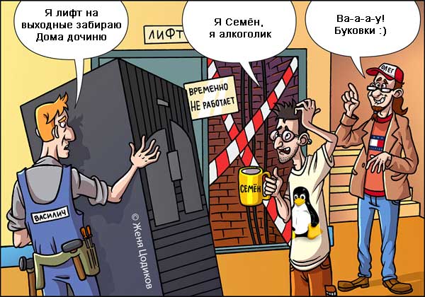 Ситуация банальна до безобразия. В дата-центре есть несколько грузовых лифтов для подъема оборудования, но, как всегда, в тот момент, когда привозят наиболее дорогостоящее и габаритное оборудование, которое кровь из носу нужно установить именно сегодня, лифты ломаются, неожиданно становятся на техобслуживание и т. д. Вот в такую незамысловатую ситуацию попали наши герои. Предлагаю всем озвучить их диалог. Лучший вариант будет использован в финальной версии иллюстрации.