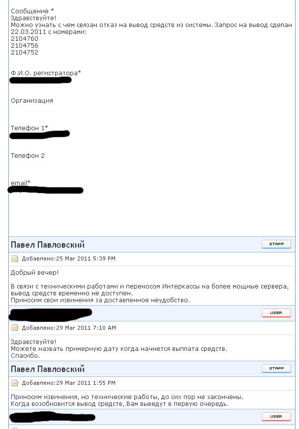 Я владелец интернет ресурсов которые были подключены к платежному шлюзу Интеркасса сайт www.interkassa.com_, через который в основном собственно и шли мои платежи. Работал с данной системой более года и все было безупречно. Но однажды, администрация данной системы отказала мне выплатить сумму денег в размере 860.46$. Для начала мне сказали, что задержка с выплатами связана с переходом их системы на новый сервер, продолжая тем самым ввод денег через мои сайты. Это вызвало у меня подозрение и я отключил данную систему от сайтов. Далее, не объясняя ничем конкретно свои действия администрация данной системы просто проигнорировала мои письма.
