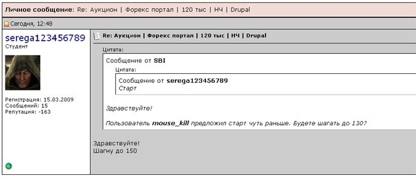 Принят старт от пользователя mouse_kill в личку и сразу шаг до 150 wmz от пользователя serega123456789. Аукцион продолжается!