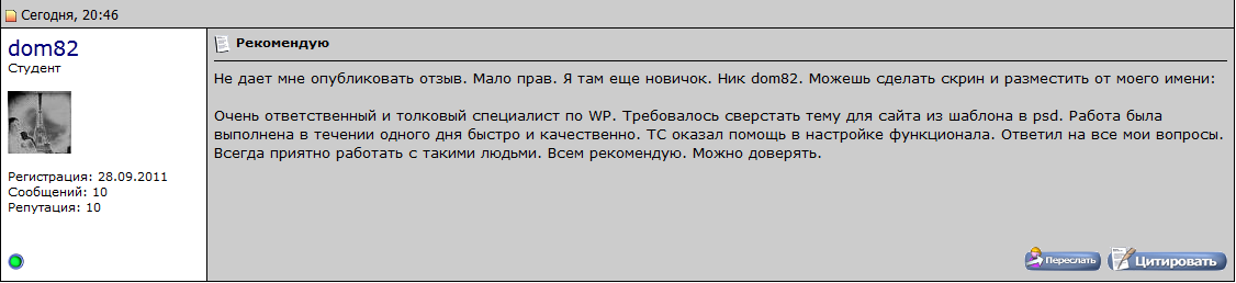 Пользователь dom82 из-за отсутствия прав написал в личку отзыв.