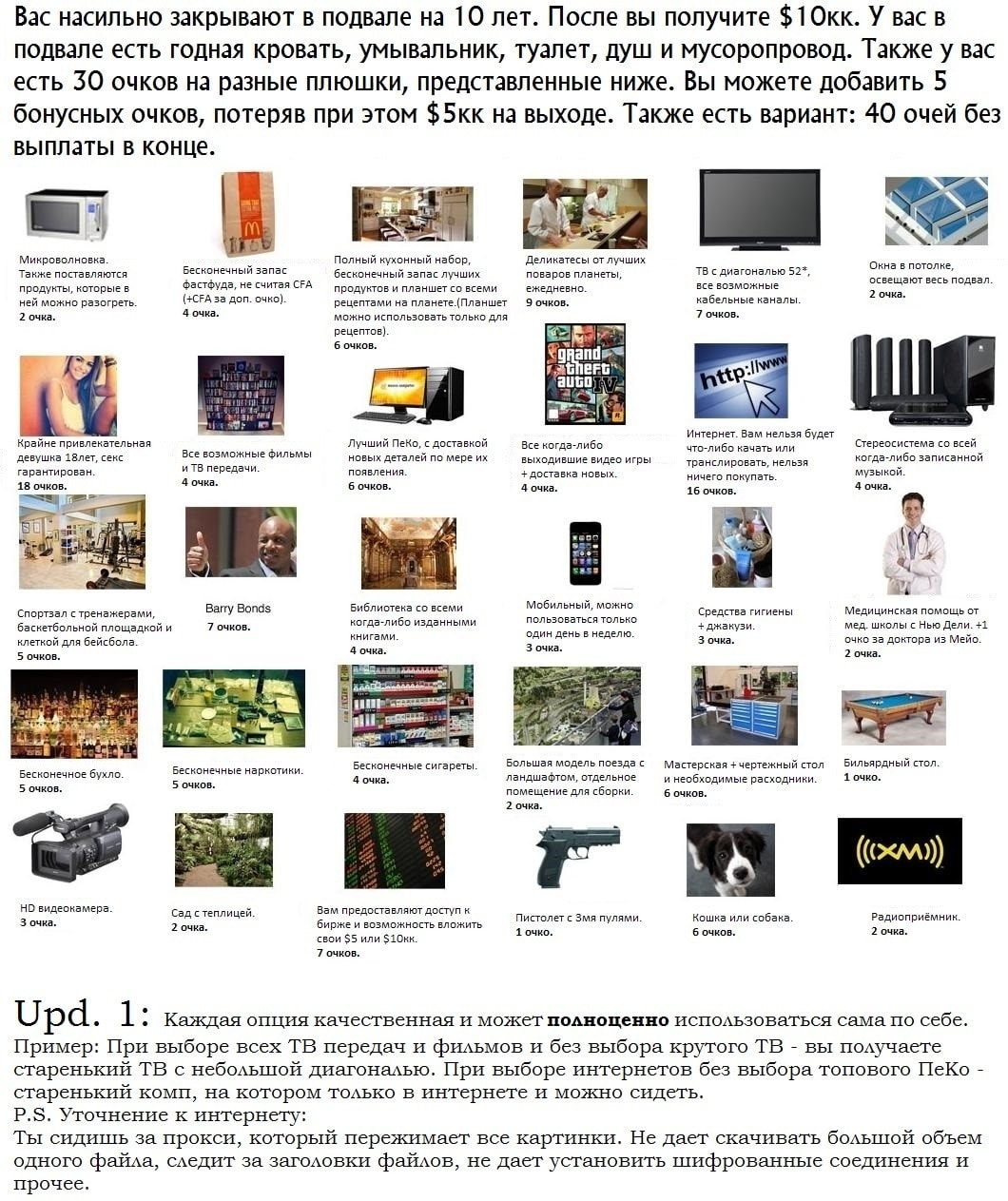 Не нравится мне этот вариант с подвалом. Ни за что не согласился бы. А вот необитаемый остров в тёплом море с лагуной и кокосовыми пальмами, этакий баунти, над этим можно было бы подумать. Обязательным небонусным условием я бы обозначил 1-2-3 блондинки/брюнетки (мне рыжие нравятся), т.е. сколько осилишь.. 😂