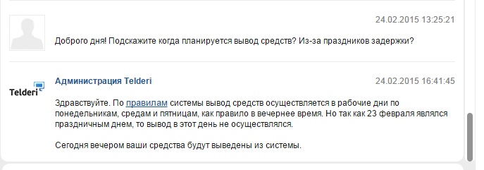 vilisan2, я если честно никак не влияю на выплаты в Телдери, черканите им в суппорт (предпочтительней) или подождите пока их представитель на форуме ответит.