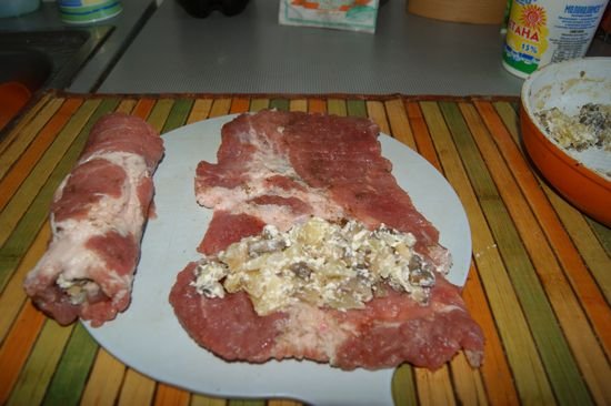 Далее, грибочки (кому по вкусу поганки, может и их) кладем на мясу и крутим рулет!
