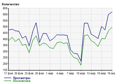Сайт о здоровье и красоте. Joomla. Начат в апреле 2009-го. Посещаемость сейчас 400-490. Была последние полгода в районе 350, но сайт был в бане Касперского, о чем я, к сожалению, не знала. Вытащили буквально пару дней назад и посещаемость сразу на 150 человек увеличилась.