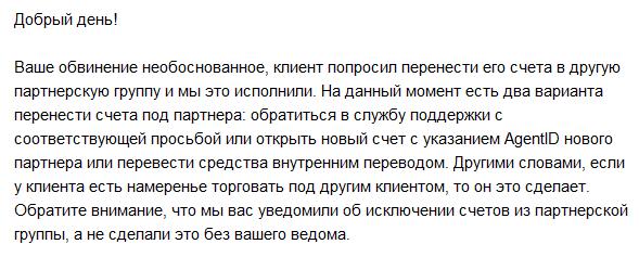 На основании заявки клиента счета "xxxxxxx" клиента "xxxxxxxx" был(и) перенесен в другую партнерскую группу.>>>