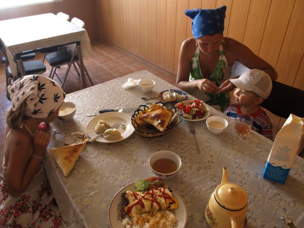 Приехали к серегиной сестре. На самом деле там живет сразу несколько поколений, как и полагается в Азии: дедушка, женщина лет 50ти (свекровь), сестра Сереги с мужем и совсем мелким ребенком. Нам они предложили занять второй этаж дома (веранда). Все очень просто, как в СССР. Собственно, там все вокруг "как в СССР". Цену предложили совсем смешную - 300 сом в день со всех. Это примерно 200 руб.