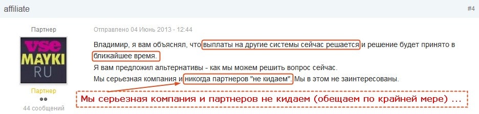 Офф. Майки ответьте полным письмом в чём причина "блокировки" данного человека, если на момент слития трафика была договорённость с вашим сотрудником. ( Я не думаю что его решение не имело веса, т.к у обычных партнёров нету доступа к связи с руководством, для этого и берутся сотрудники )