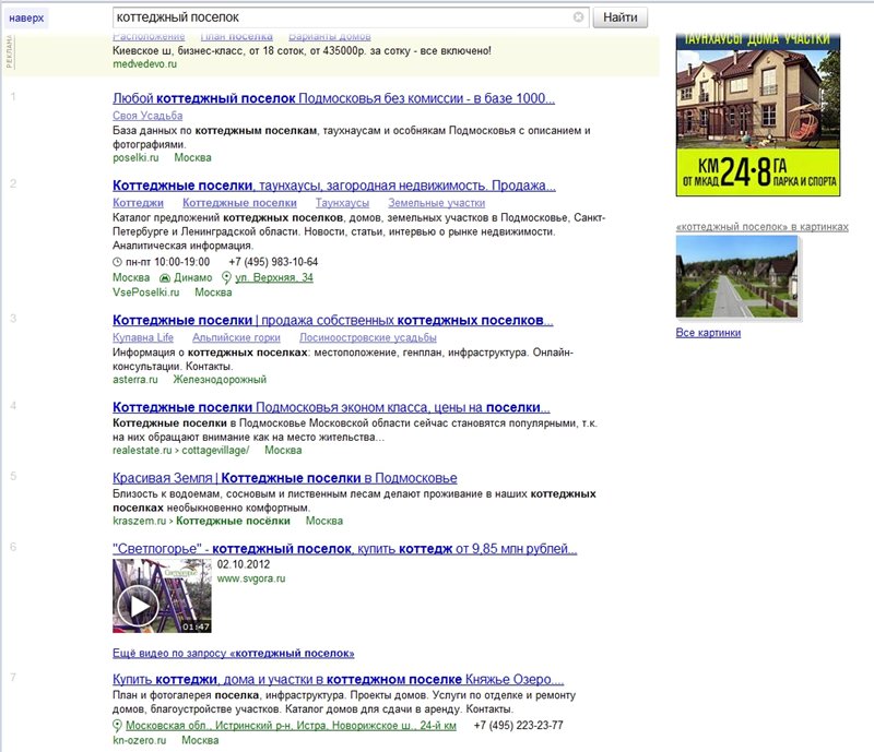 По запросу "коттеджный поселок" выводится видео в сниппете.