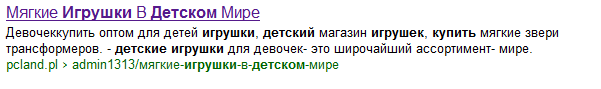 Если перейти на сайт, то дескрипшена там нет и текста адекватного тоже нет. Это, конечно, дор какой-то, но сразу видно, что яндекс в дескрипшен анкоры ссылок взял. Каша. И, естественно, позиция over500.