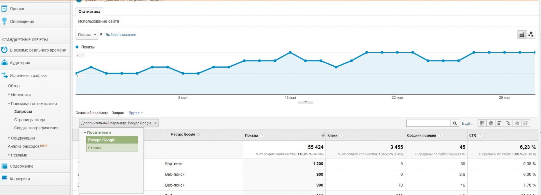 Проблема в том что не могу посчитать траффик с веб-поиска Яндекса. За вычетом яндекс картинок и прочих источников. Вот у Google можно выбрать в Поисковая оптимизация - Запросы - Дополнительные параметры - Ресурс Google. И тогда получается то что нужно, там запросы разбиваются на веб-поиск, картинки.(см.скриншот) Как так же сделать с Яндексом?