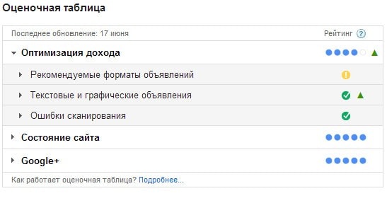 Появилась новая опция в интерфейсе - оценочная таблица показывающая рейтинг в системе по разным критериям: оптимизация дохода, состояние сайта, Google+