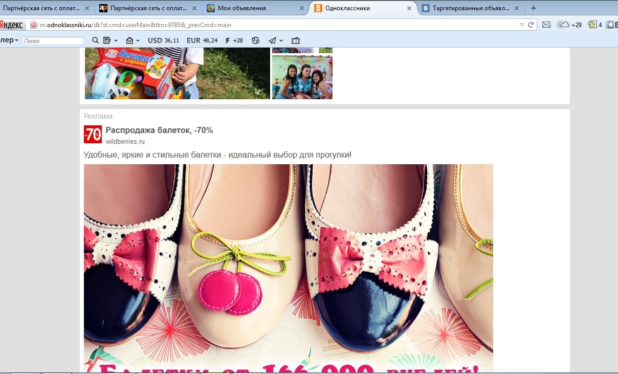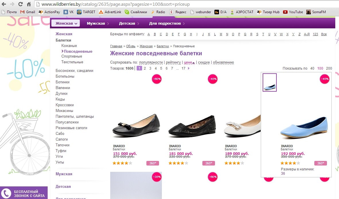 Для теста был выбран оффер интернет магазина модной одежды и обуви Wildberries Беларусь. Объявление было показано в период с 25 по 27 июля. Бюджет рекламной компании составил 1550 рублей. В качестве лендинга была выбрана страница с вполне продающимся товаром - женские повседневные балетки. Весомое преимущество этих товаров - это скидки, призванные склонить потребителей к покупке уже после перехода по объявлению.