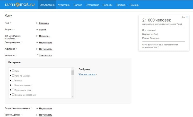 Настройки таргетинга минимально ограничивали аудиторию объявления для максимального охвата. Прежде всего, был включен таргетинг по полу, ведь товар рассчитан исключительно на женскую аудиторию. Далее аудитория была сегментирована по типу устройства. Новый формат предполагает баннеры большого разрешения - 1080х607. Поэтому, объявление было таргетированно только на планшеты. Безусловно, была ограничена география показа. Ведь ЦА продвигаемых товаров - жители Белоруссии. Последняя категория таргетинга тестового объявления касалась интересов. Категория "Женская одежда" помогла показать рекламу наиболее заинтересованной в товаре аудитории. Остальные настройки таргетинга не учитывались при размещении. Таким образом, аудитория объявления составила 21 000 человек.