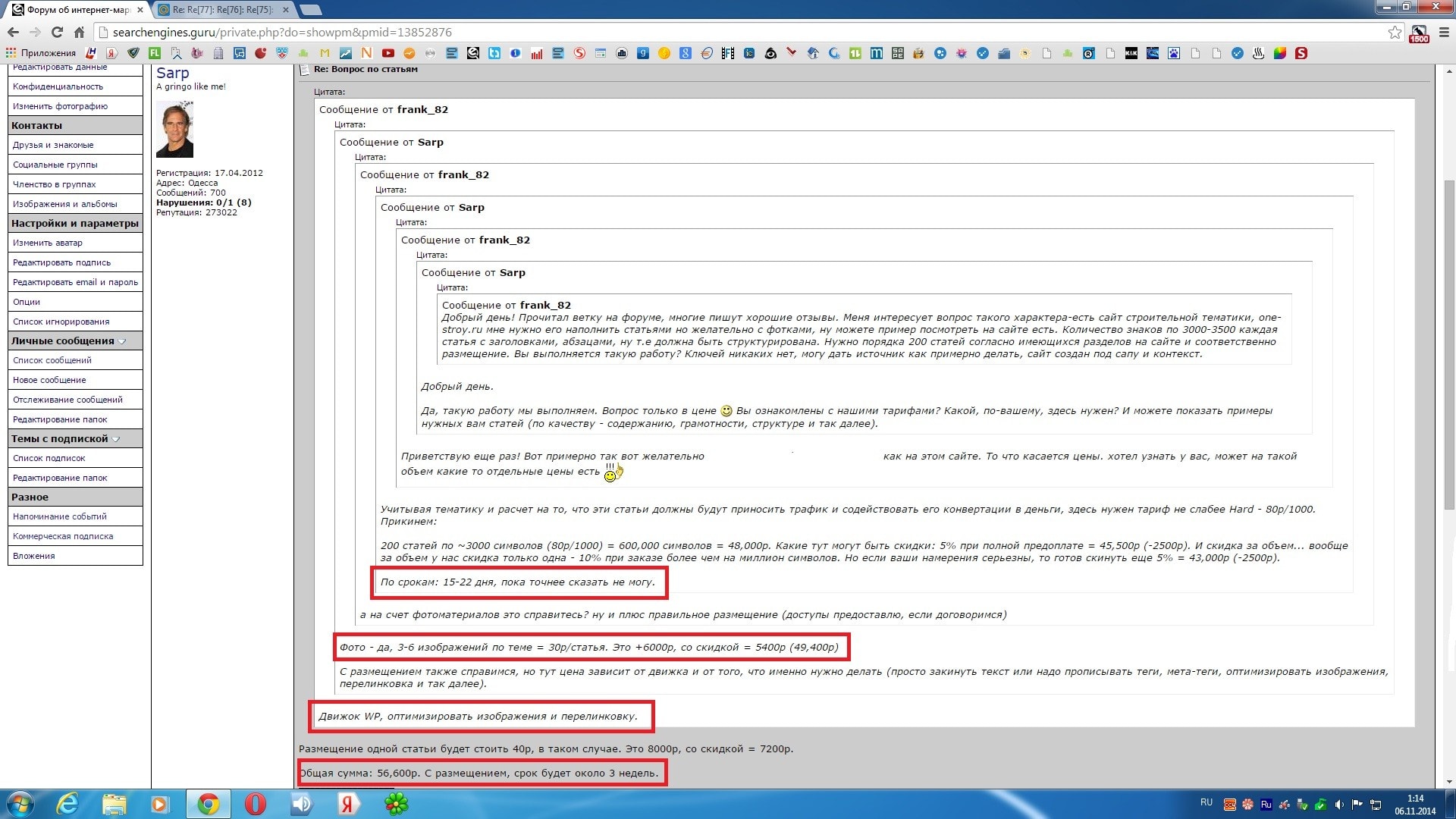 деньги перечислил 3 этапами, начал в сентябре в двадцатых числах-в начале октября полностью рассчитался. причем ТС постоянно спрашивал когда же следующий транш, не написав ни одной статьи (не, одну написал-тестовую). Предоставил доступы, проходит какое то количество времени