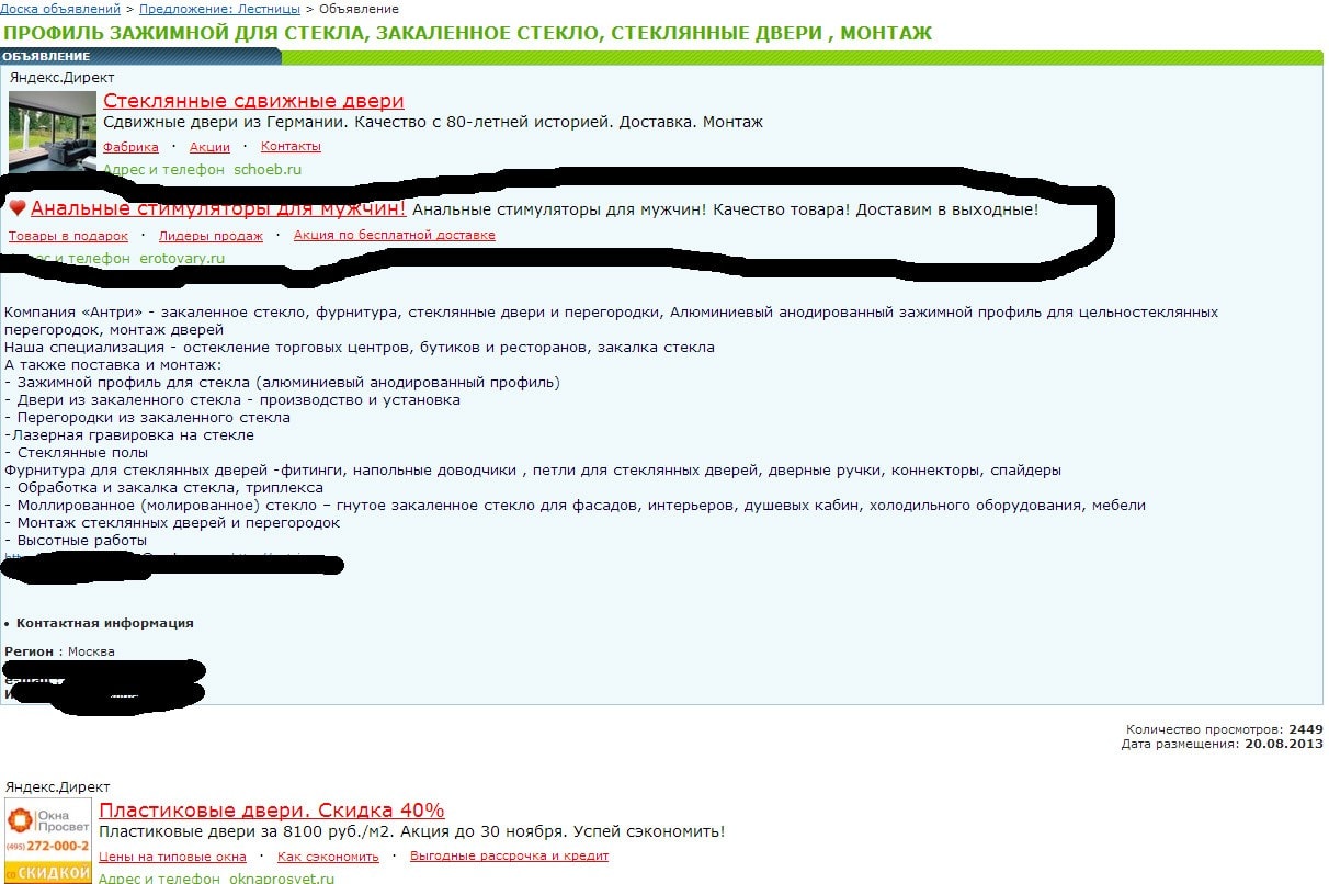 господин Qzmin, а вот когда вы заводите разговор о качестве площадки, как считаете данные объявления как вообще влияют на качество площадки, без относительно в РСЯ вообще? я понимаю можно сейчас поинсинуировать на тему ПТ. Но ваша система пропускает объявления мало того вообще не имеющее никакого отношения к тематике сайта, моему ПТ и тп, так без значка +18, да просто порнографию на взгляд очень многих людей, "анальный стимулятор" - это именно порнография, не хотите попробовать перед обедом например? я лично категорически не хочу видеть данные объявления у себя на сайтах. Я очень вас прошу ограничить сайты от этого дерьма... или поясните по какому праву или супер алгоритму РСЯ эти паганые объявления крутятся у меня сайте? Как вы считаете какое мнение посетителя о сайте формируется, когда он видит рекламу анальных стимуляторов на строительном сайте?