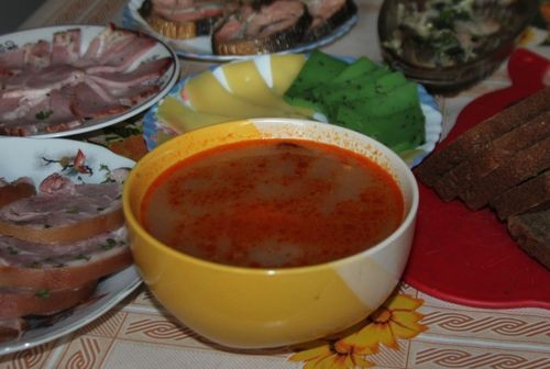 студень из говяжьих рулек, икра красная, говядина запечёная в фольге, салатов куча, ну и шампанское и водочка. :-)))