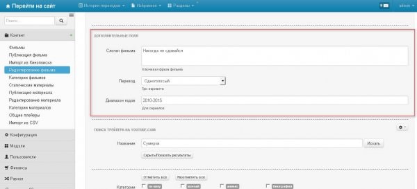 По просьбе покупателей добавлен модуль - "Дополнительные поля". Модуль предназначен для добавления к параметрам фильма полей, содержащих дополнительную информацию. Например можно добавить варианты перевода: дубляж, закадровый и т.п. После создания дополнительных полей в админпанели на странице редактирования и добавления фильма появится блок для данных полей.