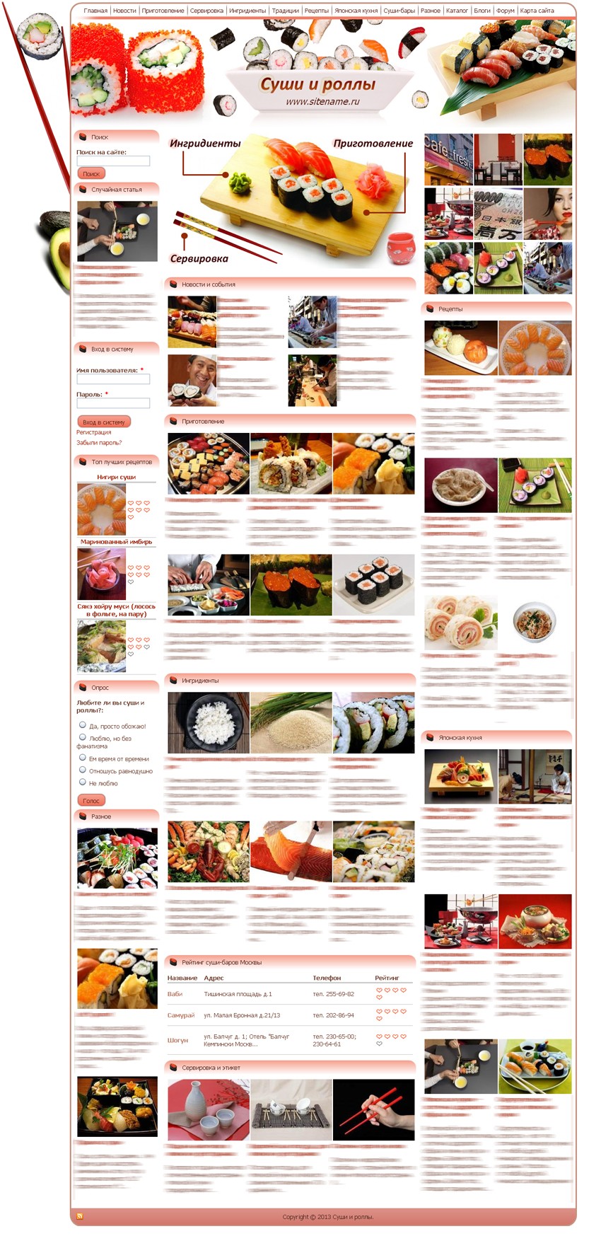 Контент: ручной рерайт + копирайт. Тематические статьи - уникальные, интересны. Рецепты различных вариантов роллов и некоторых других японских блюд - все уник. Общий объем контента: около 190 тысяч символов. Каталог суши-баров Москвы. Общее кол-во страниц на сайте, учитывая каталог - более 600!