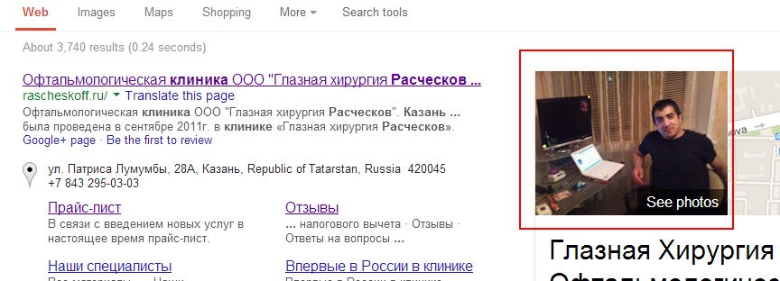 Подскажите как убрать чужое фото, из выдачи гугла "Клиника Расческова Казань"