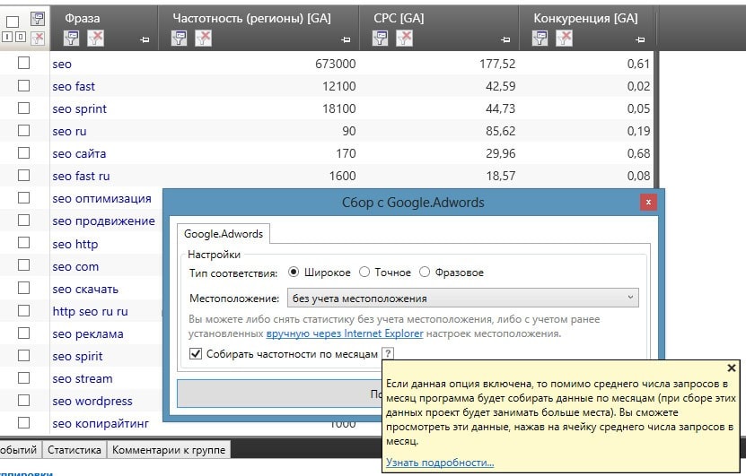 porh, цену клика, частотность (в том числе по месяцам), уровень конкуренции.