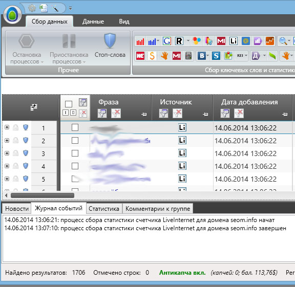Что то сегодня не могу спарсить статистику по ключам из Ливинтернета. Ставлю за последний месяц - выдает сразу только 100 запросов. При этом индикатор активности программы со временем крутит мегабайты - уже 250 накрутил. При принудительном обновлении таблицы - все те же 100 результатов.