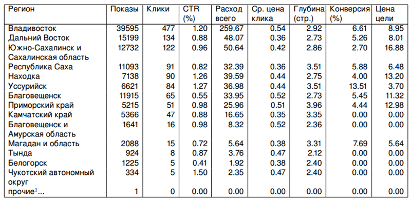 в каких регионах показывались объявления, которые отражены во второй строчке "Дальний восток" (это административный округ)?