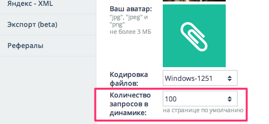 В Личном кабинете, в профиле, среди прочих настроек есть возможность управлять количеством отображаемых запросов на странице Позиции для всех ваших проектов.