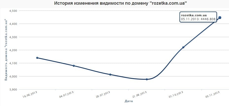 Апдейт сервиса производится примерно раз в месяц. Соответственно, Вы видите динамику изменения видимости Розетки от месяца к месяцу. Рост, как в учебнике, вправо вверх означает, что у Розетки сейчас, простыми словами, "все хорошо":) Понятно, чем больше видимость - тем больше трафа собирает сайт.