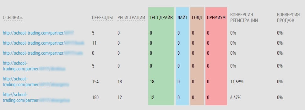 В разделе «Аналитика» отображается общее количество переходов, регистраций, покупок каждого ТП, конверсии регистраций и покупок по каждой созданной ссылке, чего вполне достаточно для анализа эффективности каждого отдельного источника траффика.