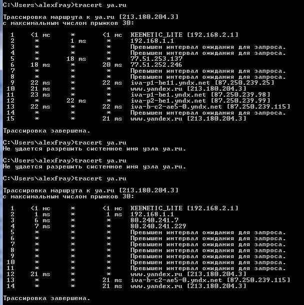 проблемных хостов как таковых нет, любой сайт открывается то хорошо, то плохо, то никак, вот сделал 4 раза подряд tracert до ya.ru например: