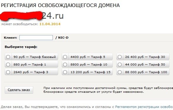 Там сможете заказать регистрацию своего освобождающегося домена по тарифу, который вас устроит, в зависимости от тех тарифов, которые вам предоставил регистратор, как клиенту.