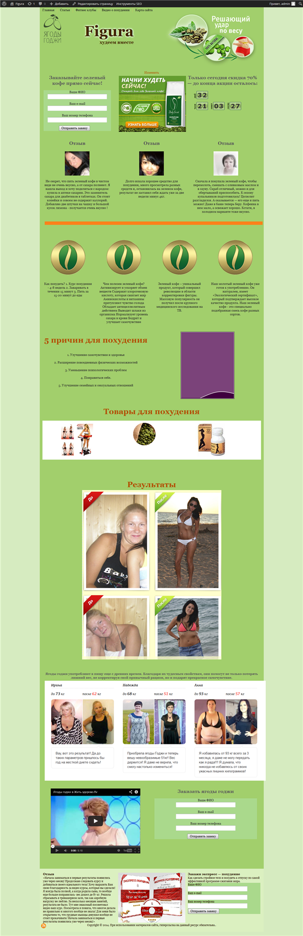 Движок: Wordpress. На лендинге расположено 6 партнерских блоков от партнерских агрегаторов: e-autopay.com, express-pohudenie.ru, afreкточкаru. В итоге получилось 6 лендингов в одном по таким партнеркам: зеленый кофе, ягоды годжи, экспресс похудение, диета на основе 25-го кадра, видео курс по диетологии, видеокурс с секретами похудения . Установлены и настроены такие плагины: rus-to-lat, карта сайта, контакты, слайдер, карусель фото.