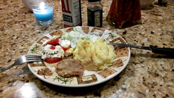 Сегодня у нас на ужин стейк из говядины, картофельное пюре, огурцы со сметаной и помидоры с сыром.