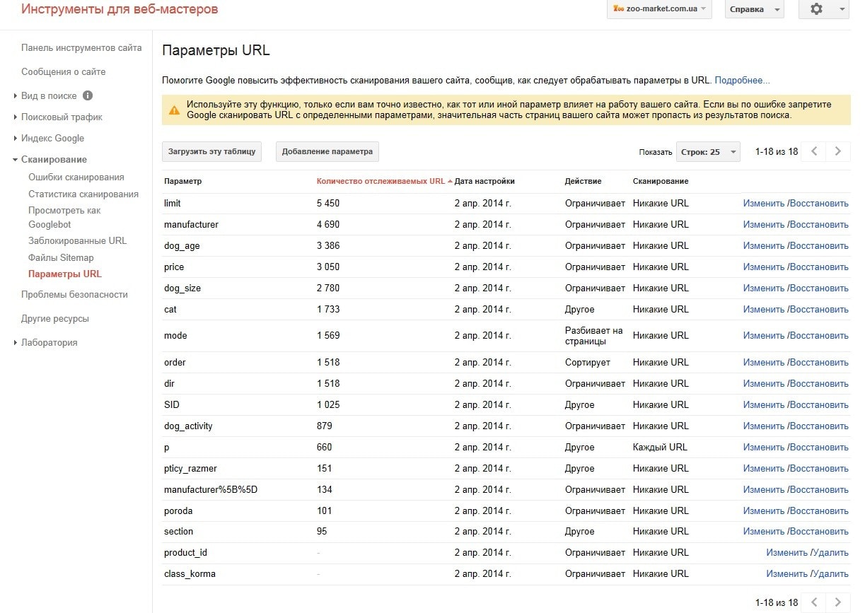 А теперь я хочу понять, что делать с "Параметрами URL" В WMT. Вот так выглядит сейчас эта страница. Смотрю на нее и плачу. Я заблокировал сканирование страниц со всеми параметрами в адресе, кроме "р" - номера страницы в каталоге. Насколько это правильно? Или, может быть это совсем не правильно, а нужно сделать как-то по другому? В общем, как заставить робота проиндексировать все товарные страницы?
