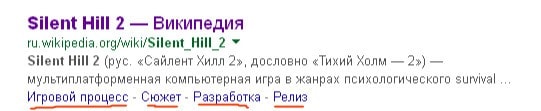 Вопрос в следующем. Я хочу, чтобы в быстрых ссылках в результатах поиска отображались эти разделы, пусть не все. Так как это получается у Википедии.