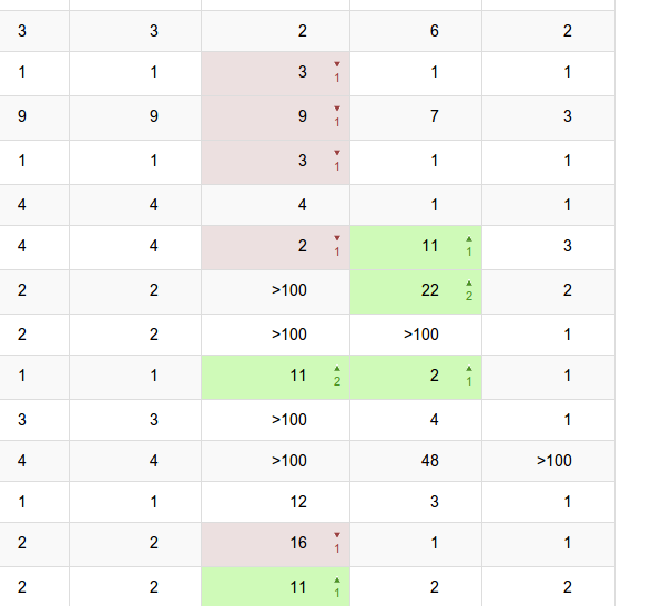 предложение расцвечивать только значение изменения, сделать его крупнее, как минимум не меньше по размеру чем значение места. Стрелка в верх и вниз менее понятно чем плюс и минус. Оригинальными быть круто, но не стоит этим увлекаться, классика как то более навека.