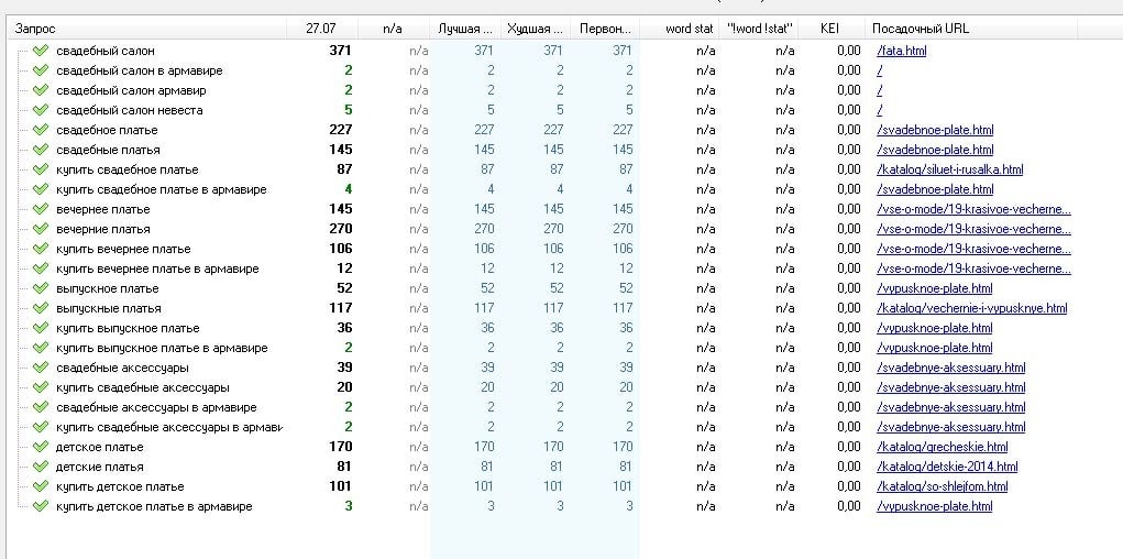 Такая история уже не один месяц Главная страница свадебного салона заточена под запрос "Свадебный салон" на нее с соответствующими анкорами и прямыми и разбавлены вечных ссылок штук 20 куплено на сапе около 40 (именно для главной, не считая для других) конкуренция по моему краю "!свадебный !салон" меньше 50 Почему так? И по некоторым другим запросам, например "!купить !вечернее !платье" по вордстату 13 а сайт по этому запросу на 3-й странице, хотя так же и вечные ссылки и с сапы есть.... Что еще нужно?