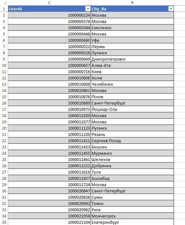Есть Столбец 2 с городом, откуда пользователь. Эти 2 столбца между собой, связанны