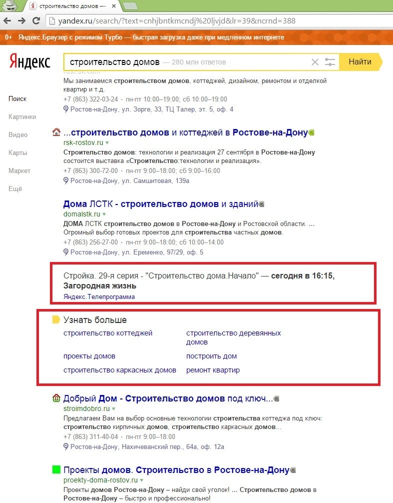 Теперь еще и подсказки в выдачу попали, я уже молчу про Яндекс.Телепрограмма по ВЧ запросу "строительство домов"