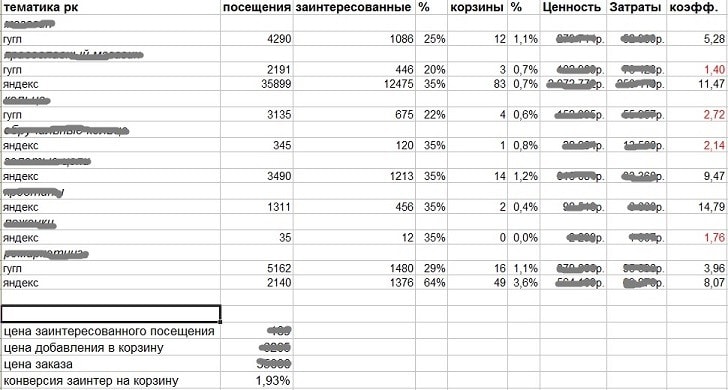 Пример заполненной похожей таблицы (для контекстной рекламы) -